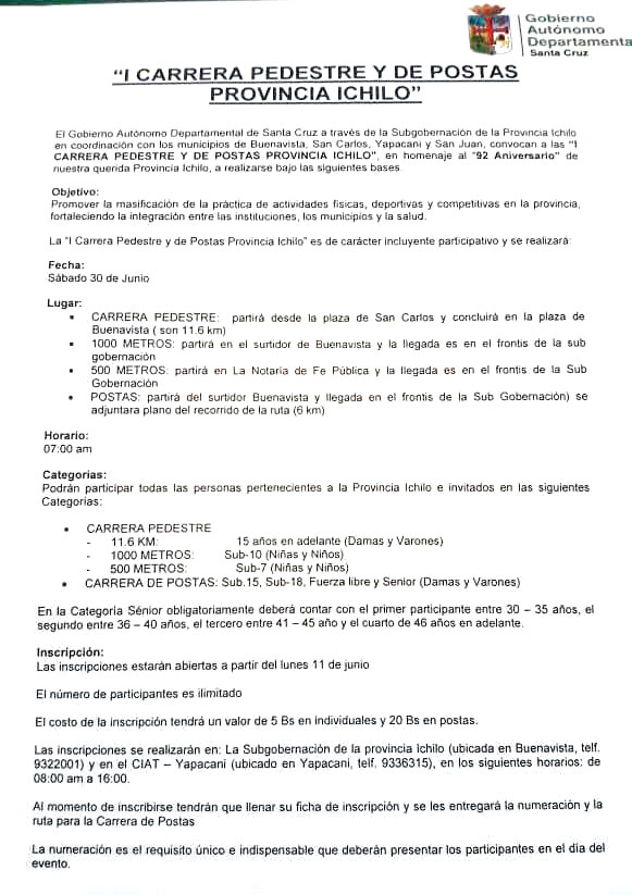 El Gobierno Autónomo Departamental de Santa Cruz a través de la Subgobernación de la Provincia Ichilo en coordinación con los municipios de Buenavista, San Carlos, Yapacani y San Juan, convocan a la "I Carrera Pedestre y de postas Provincia Ichilo" en homenaje al "92 Aniversario" de nuestra Provincia Ichilo| Fecha: | Sábado 30 de Junio de 2018 |