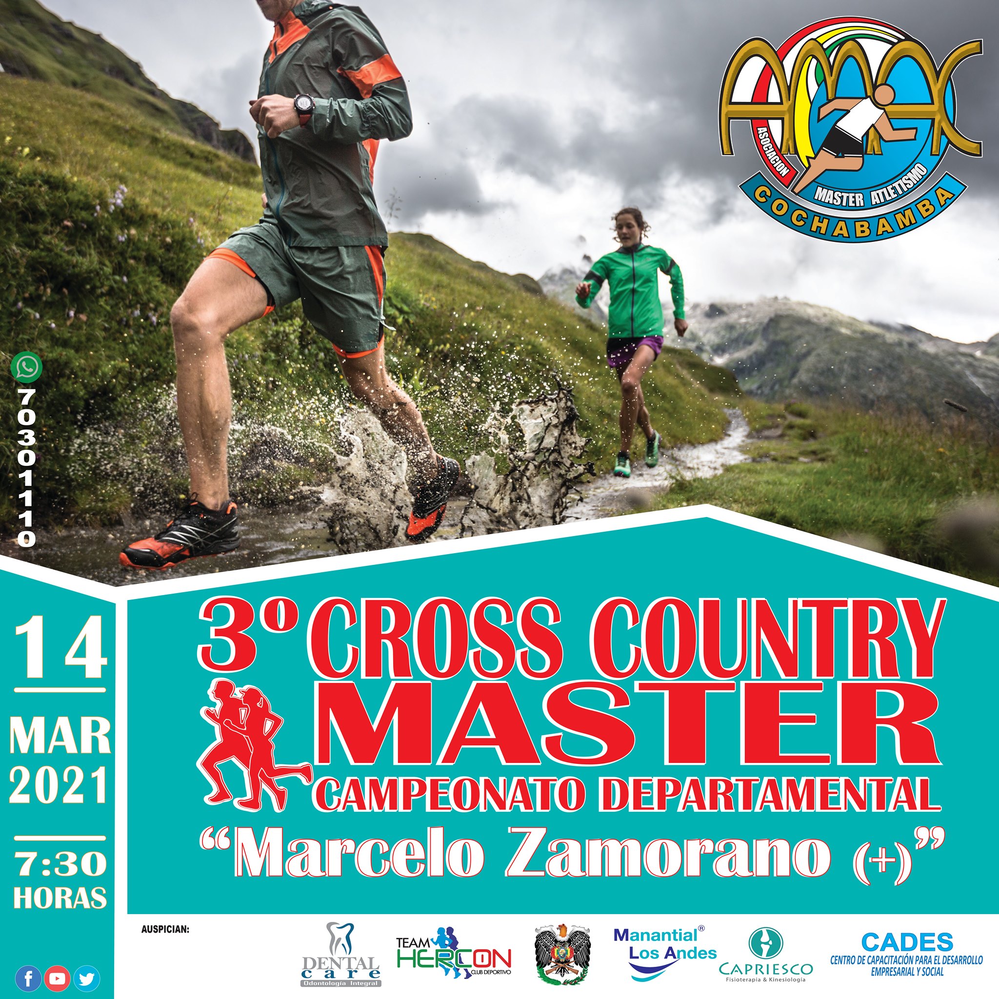 La Asociación Master de Atletismo de Cochabamba, convoca al 3º CAMPEONATO CROSS COUNTRY MASTER COCHABAMBA y Selectivo para el Campeonato Nacional de Cross Country que se realizará en el CIRCUITO AMAC Parque Metropolitano Arocagua (2 km norte Parque de las Memorias) de Sacaba - Cochabamba - Bolivia, el día domingo 14 de marzo de 2021 a partir de las 7:30 am. | FECHA Y HORA DE LA COMPETENCIA | Domingo 14 de marzo de 2021 a hrs 7:30 am. |